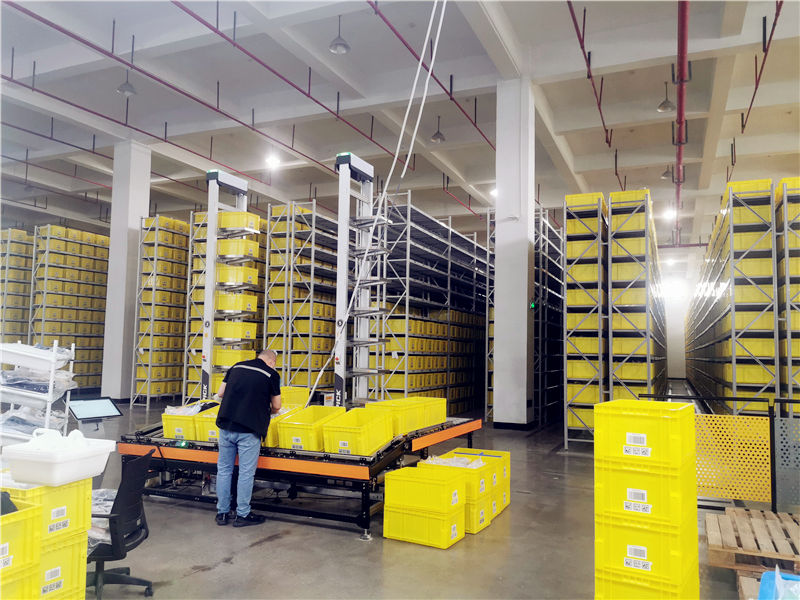 眾所周知,抗疫期間,人員不足和降低感染風險是倉儲物流環(huán)節(jié)最頭疼的問題,在寶時智慧倉,所有涉及到分揀庫區(qū)的業(yè)務流程中,工作人員都無需進入分揀庫區(qū)內(nèi)部,只需要在工作站等待,系統(tǒng)會自動指派搬運機器人將目標料箱運到工作站,待工作人員取貨后,再將貨架送回到分揀庫區(qū)。