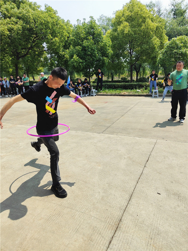 粘人的呼啦圈接下來是粘人的呼啦圈比賽,這是一項需要默契和配合的活動。需要將呼啦圈保持掛在身上,行走到終點換其他隊員,按照這樣的要求依次走完,行走過程中不可以用手觸碰呼啦圈,呼啦圈也不可以落地,中途呼啦圈落地可原地?fù)炱鹄^續(xù)行走,使用的時間最短的隊伍分?jǐn)?shù)越高。