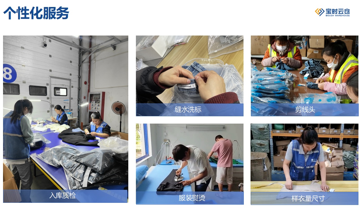 在倉(cāng)配服務(wù)方面,除了常規(guī)的倉(cāng)儲(chǔ)管理、分揀打包、快遞物流、售后服務(wù)外,寶時(shí)云倉(cāng)還提供了一系列增值服務(wù),如服裝質(zhì)檢、大燙/掛燙、掛吊牌、組套、貼標(biāo)、縫領(lǐng)標(biāo)、樣衣量尺寸、掛卸防盜扣、包裝定制等等,以滿足服裝品牌的個(gè)性化需求。