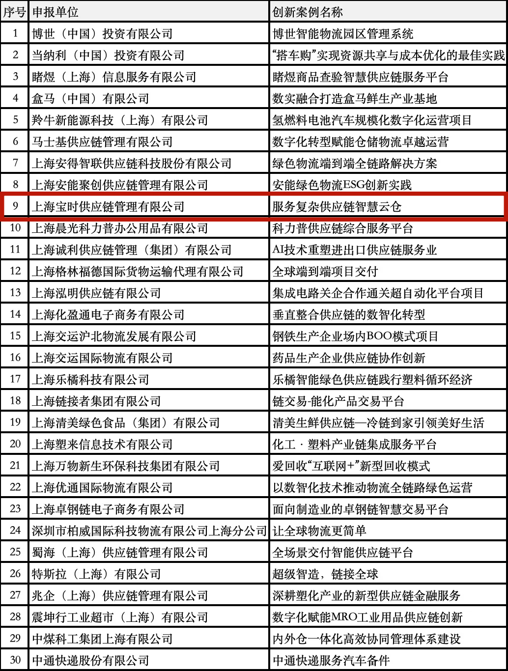 大會的亮點之一便是公布了“2024上海市供應(yīng)鏈創(chuàng)新與應(yīng)用優(yōu)秀案例”和“2024上海市供應(yīng)鏈創(chuàng)新與應(yīng)用引領(lǐng)者”名單,其中,寶時云倉憑借"服務(wù)復(fù)雜供應(yīng)鏈智慧云倉"和出色的應(yīng)用實踐,成功入選優(yōu)秀案例,同期獲選的還有博世、得物、盒馬、安能、晨光等共30家企業(yè)。