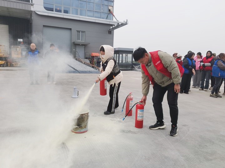 疏散演練結(jié)束后,滅火器的正確使用培訓(xùn)成為重頭戲。在各倉的演練現(xiàn)場,指導(dǎo)員潘宏浩詳細講解了滅火器操作要領(lǐng)。面對熊熊燃燒的模擬火盆,員工們躍躍欲試,紛紛拿起滅火器,按照 “一提、二拔、三握、四壓” 的口訣,對準火焰根部進行噴射操作。