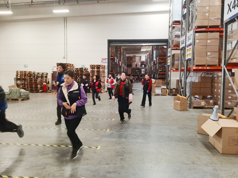 隨著警報聲在各倉區(qū)內(nèi)驟然響起,消防疏散逃生演練正式拉開帷幕。倉庫內(nèi)瞬間模擬出火災(zāi)發(fā)生時的緊張氛圍,煙霧彌漫。員工們迅速反應(yīng),按照預(yù)定的疏散路線,彎腰低姿、捂住口鼻,有條不紊地向安全出口撤離。